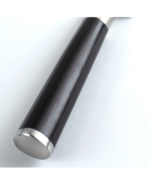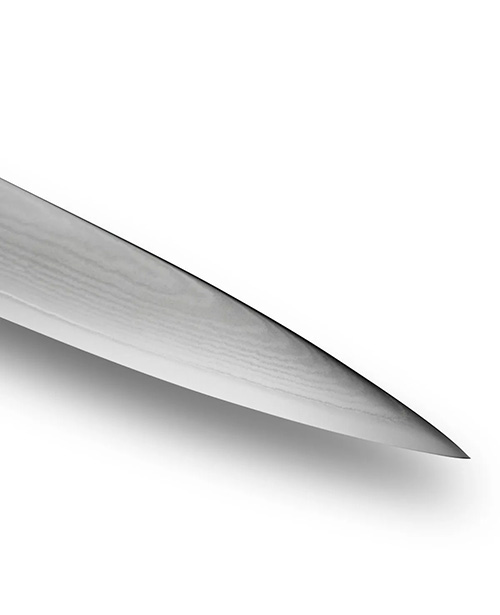 Classic's Damascus is formed by layering different types of metal alloys together, then forging them into a single piece. The process and the different characteristics of the layered metals create the rippling patterns you see on the blade. Classic knives have 34 layers of metal on each side of a high-performance VG-MAX cutting core. That added strength allows for a thinner grind, which glides through food with exceptional ease. The result is a knife that feels sharper in use, offering effortless precision and control. With each cut, you’ll notice the difference: food releases cleanly, prep feels smoother, and your knife becomes a brilliant extension of your hand. This unique geometry gives the blade a lighter, more agile feel that many describe as sharper and more precise. The difference is immediate: instead of fighting your knife, you flow through ingredients with confidence and speed. It is the brilliance of Japanese design, transforming everyday prep into a smooth, refined experience.