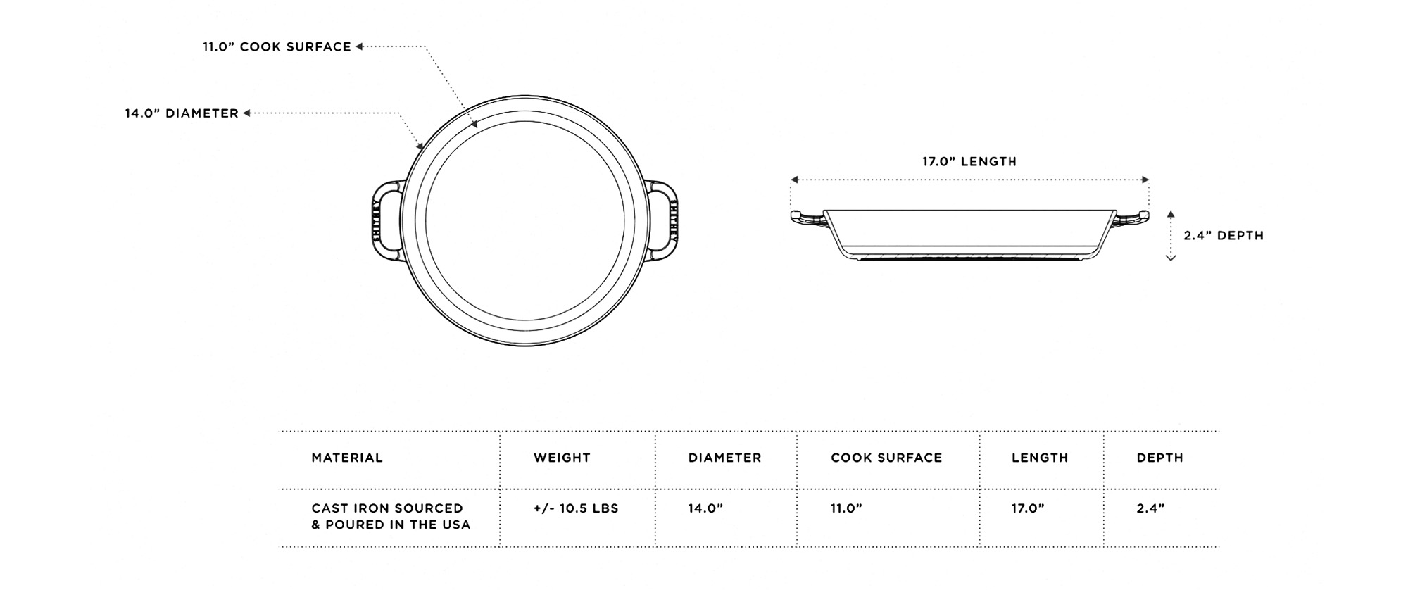 Smithey Dual Handled Skillet No. 14 features a generously sized polished interior surface and is designed for a feast. From roasting multiple game birds to searing steaks on the stovetop or grilling a dinner’s worth of vegetables on a large charcoal grill, the No. 14 is the perfect tool for the chef who cooks with pride for family and friends. Use it well!